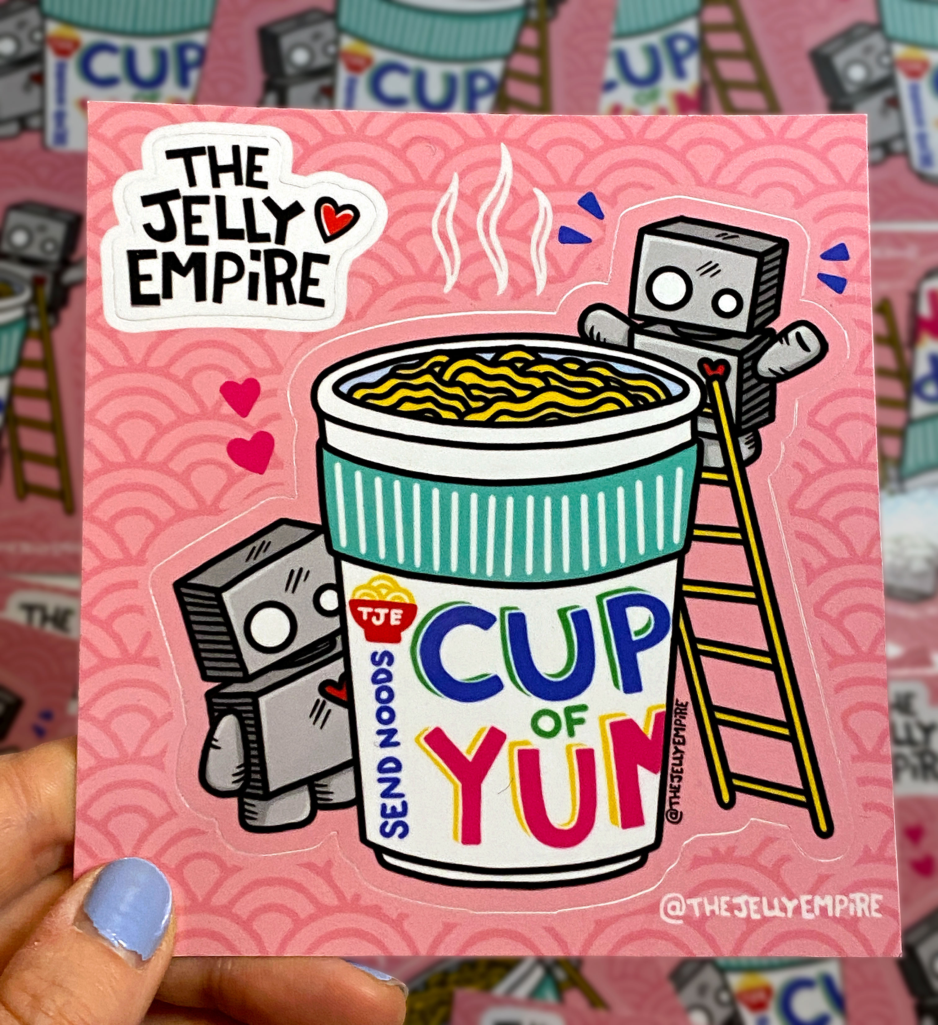 There is nothing better than some self care for your tummy. These little Jellybots are filling up their bellies with a hot cup of yummy noodles.