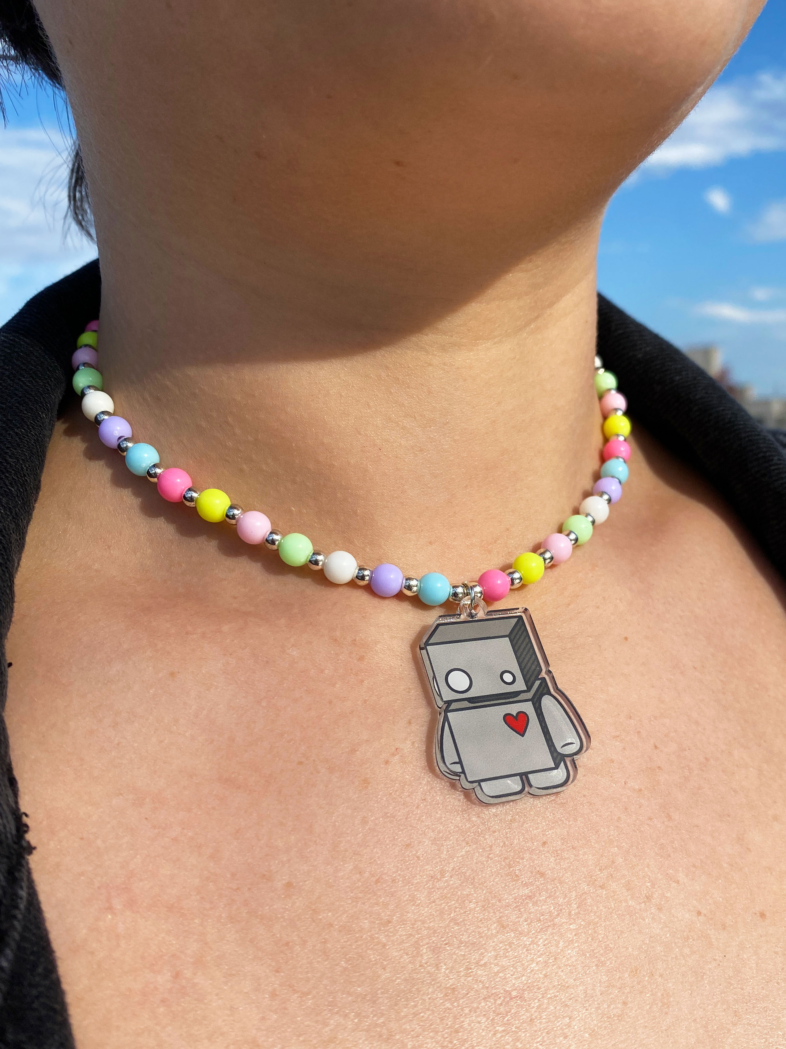 Get your 90's and Y2K vibes on with this beaded necklace that includes an 1.5" acrylic charm of Jelly The Robot.